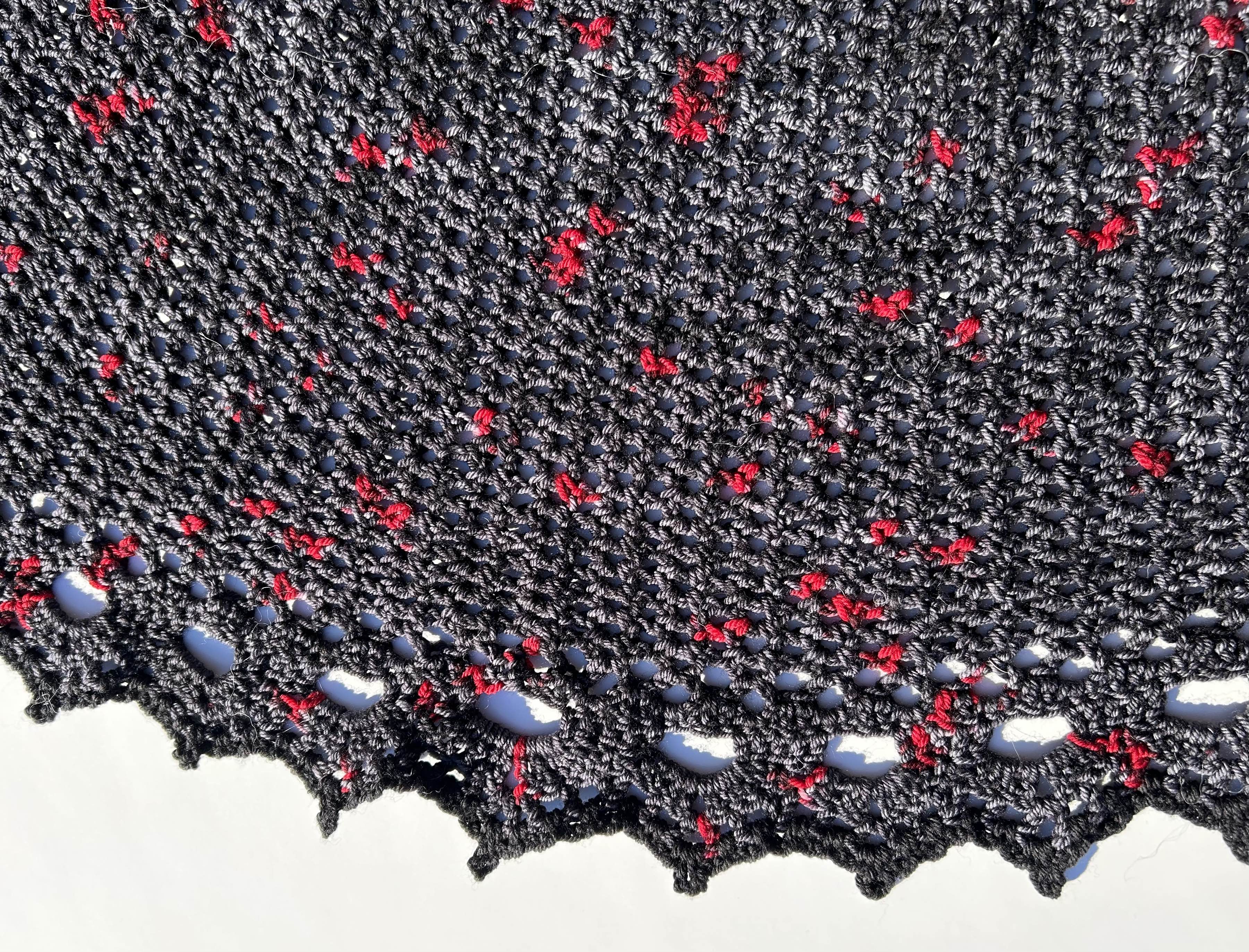 Crescent Shaped shawl in superwash wool DK yarn in a blend of two patterns from Expression Fiber Arts (Florescence Shawl and Pemberley Shawl). Very large shawl in a hand-dyed black mixed with gray and red and the occasional fleck of white. It is a large (and therefore heavier) shawl. Mannequin is a size 6, so note how long the front drape is.