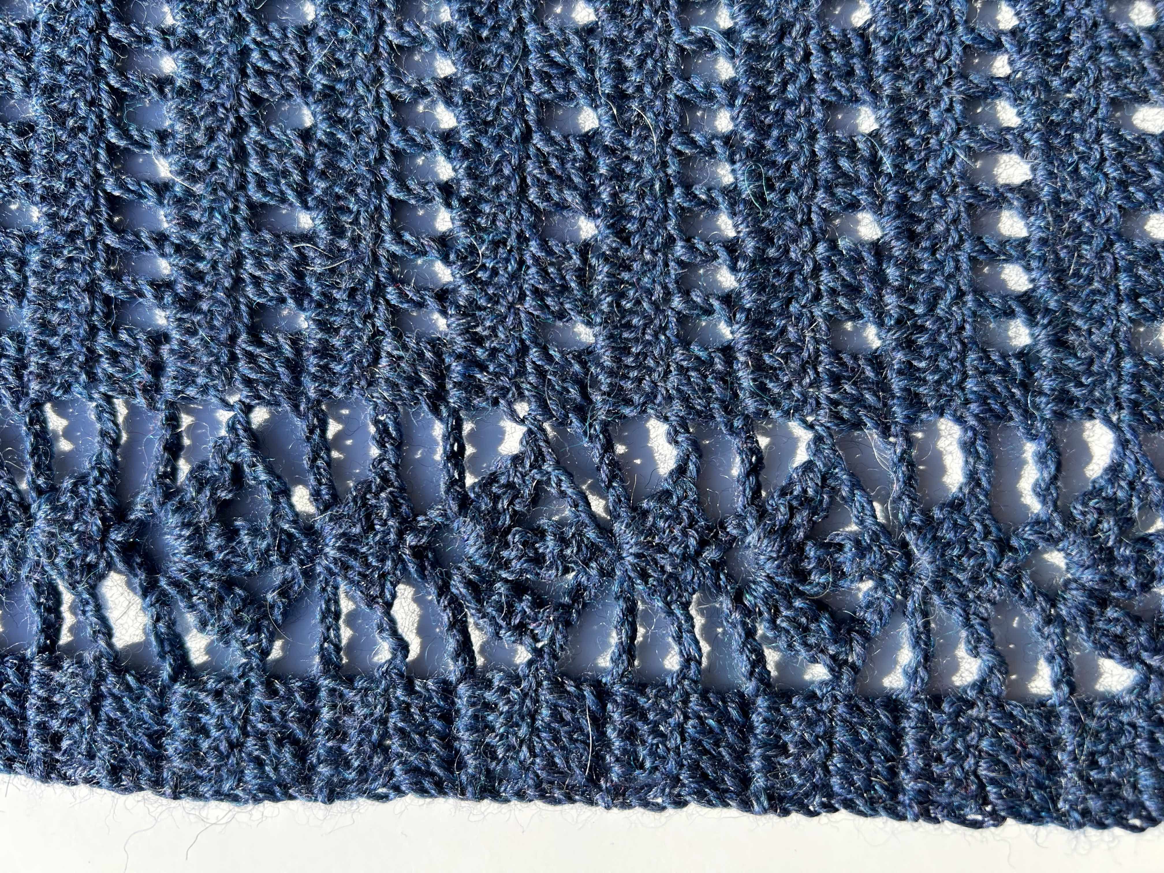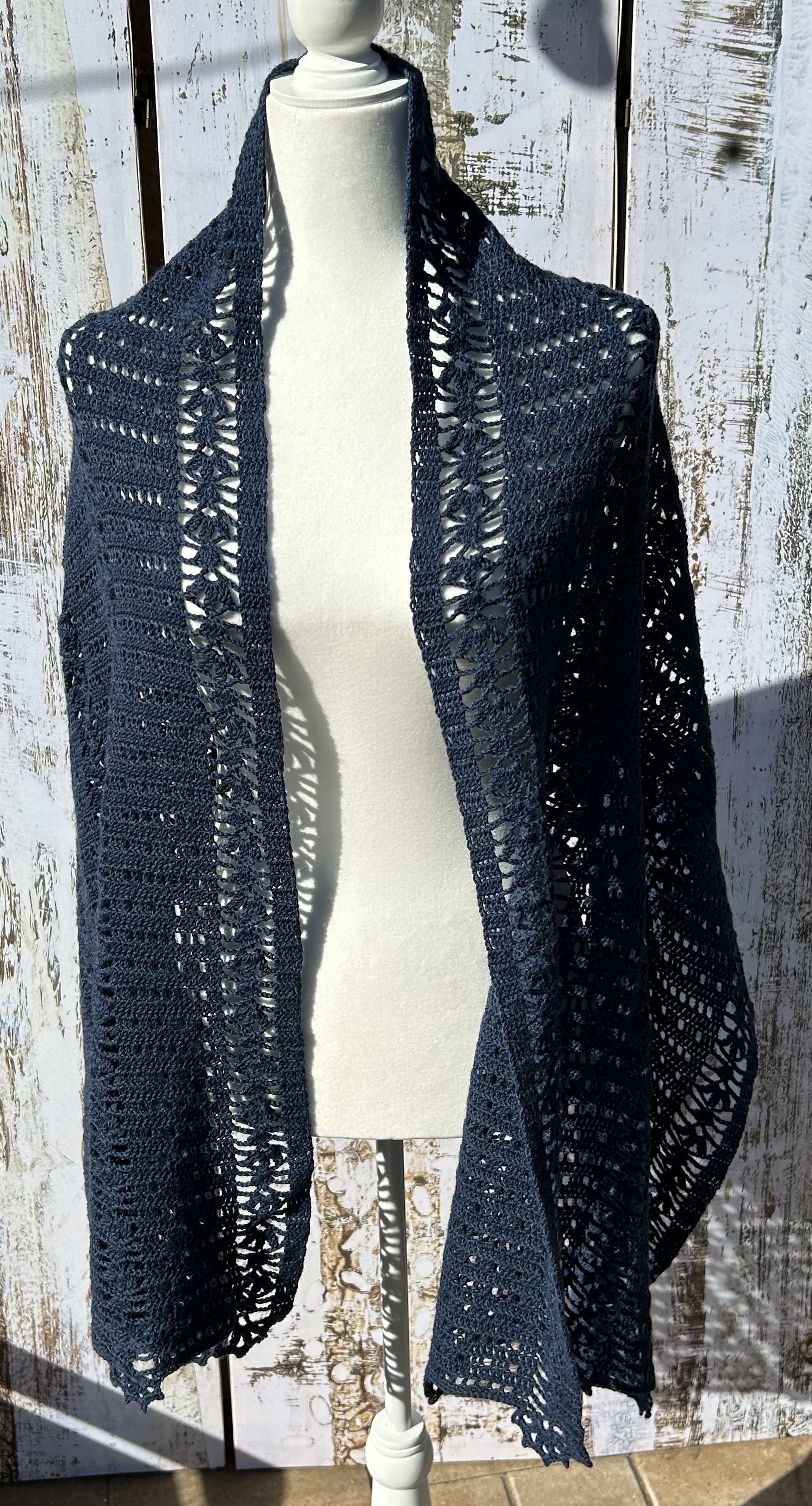 Navy rectangular stole/shawl in wool superwash fingering yarn in Kacela Shawl pattern (by Berniolie). Shawl in a hand-dyed navy blue with a great deal of tweeding.