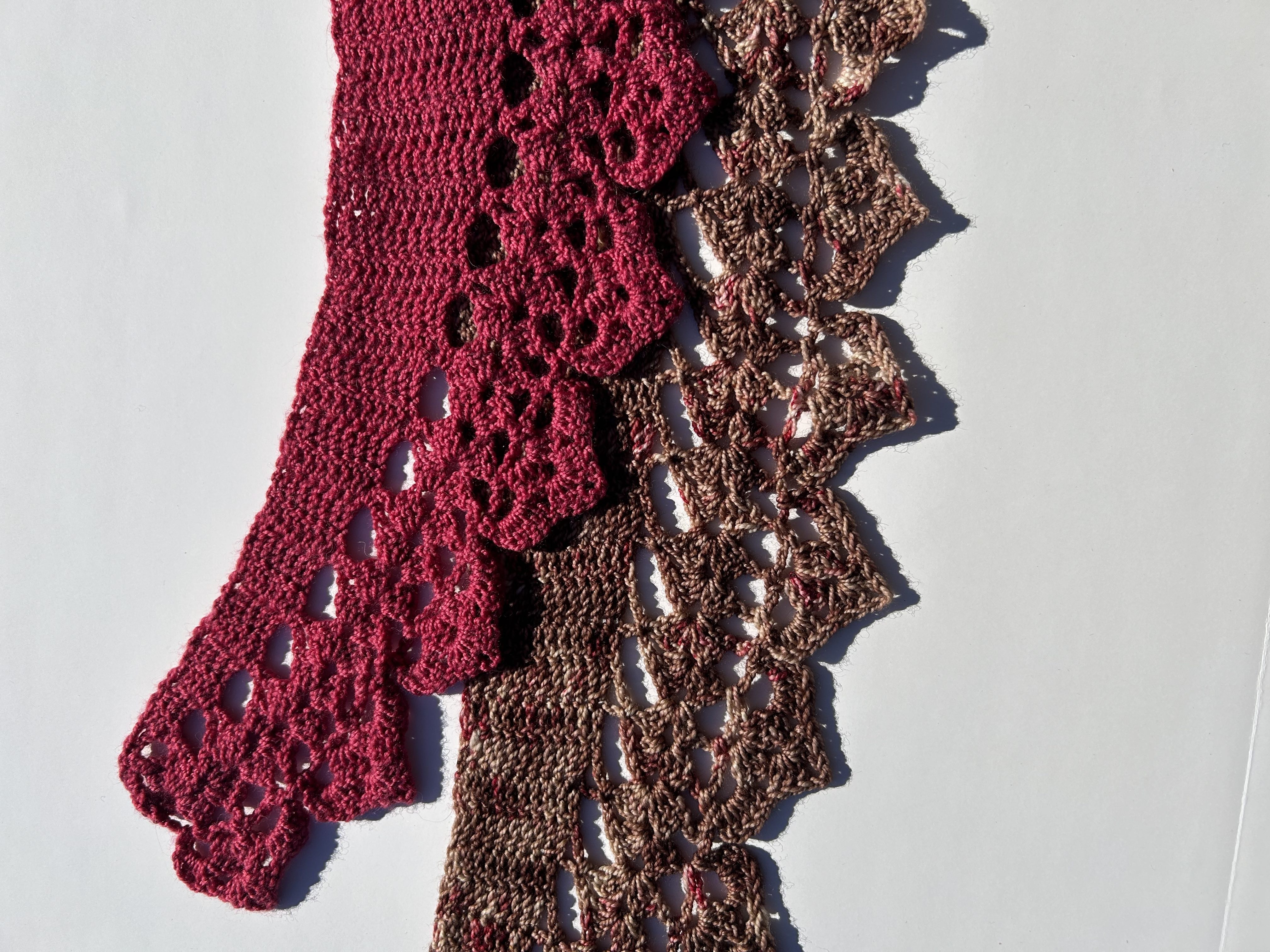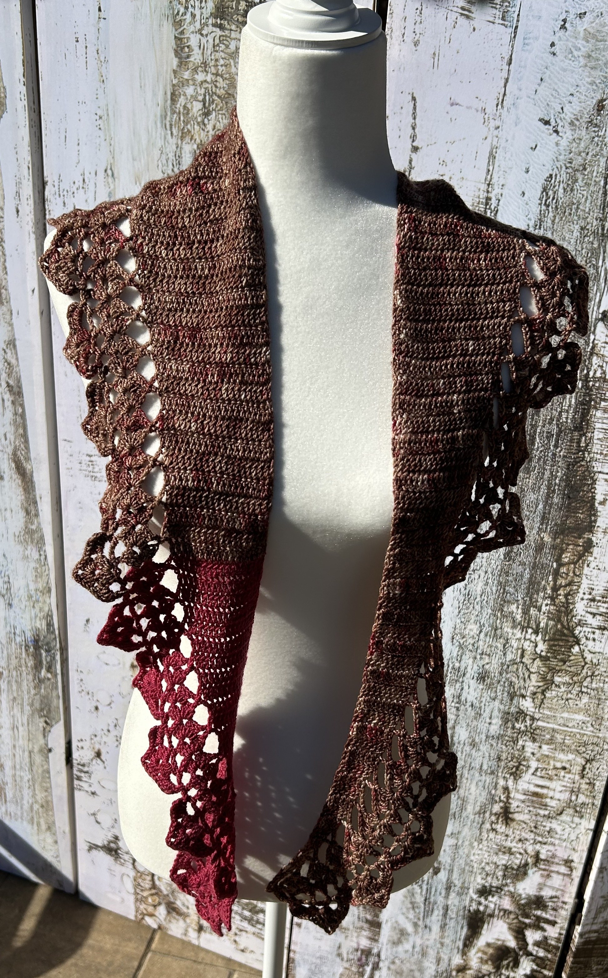 Long and slightly curved stole/scarf in a warm brown with fuschia flecking, a wool blend superwash fingering yarn in