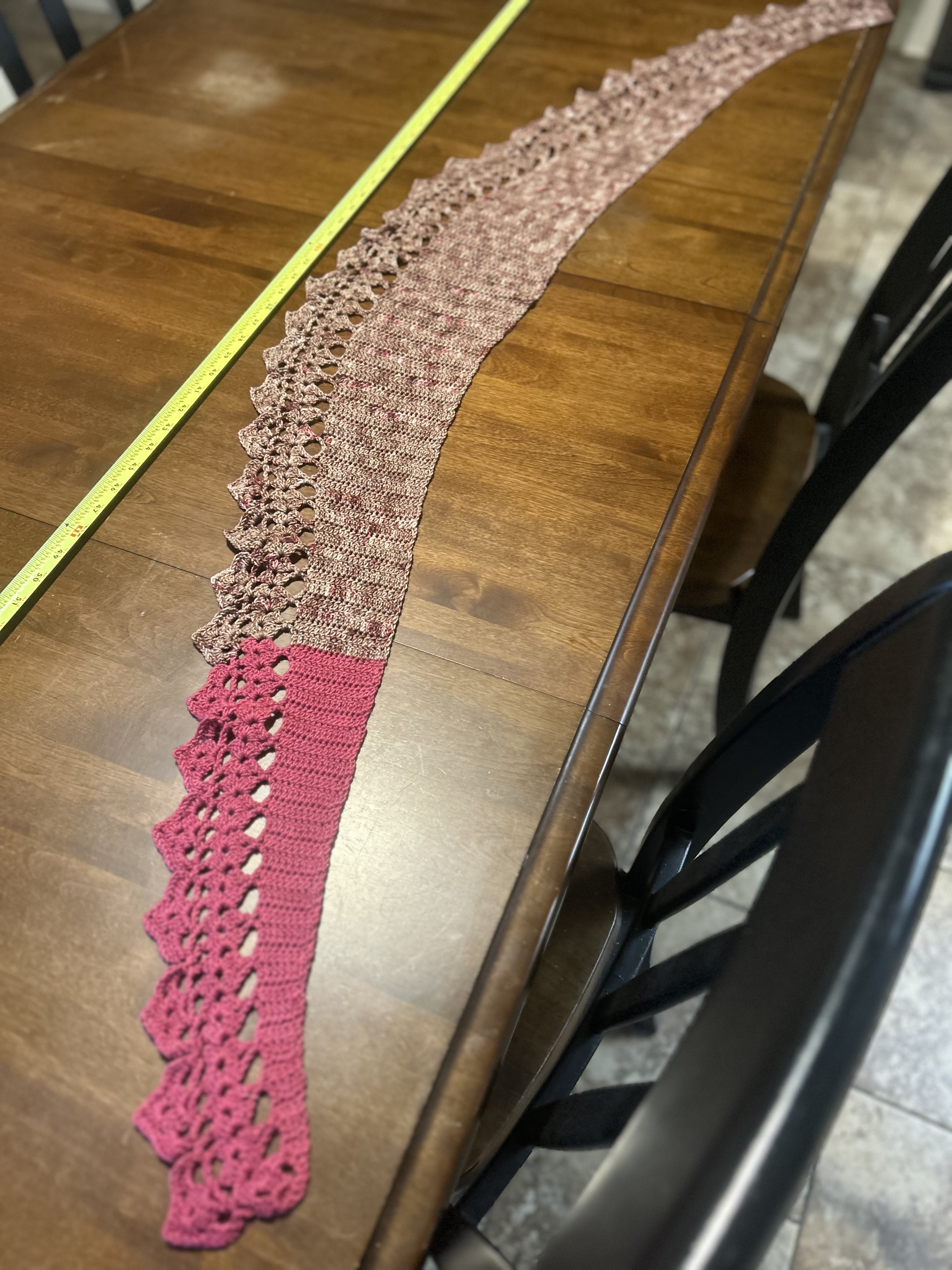 "Crescent Motif Shawl" pattern by Lorene Eppolite. Not exactly a shawl since it's less than 10" wide at its widest point. Moro of a scarf or accent to wear around the neck.