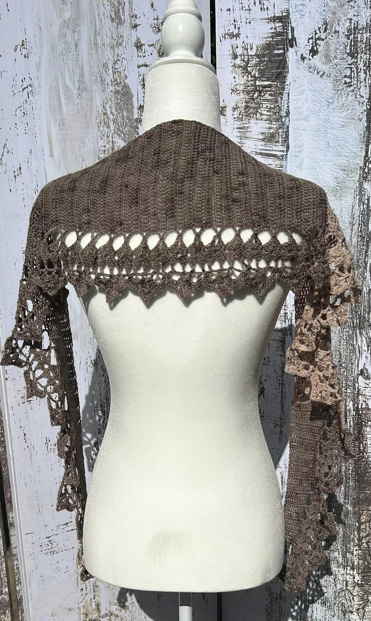 Not exactly a shawl since it's less than 10" wide at its widest point. More of a scarf or accent to wear around the neck.