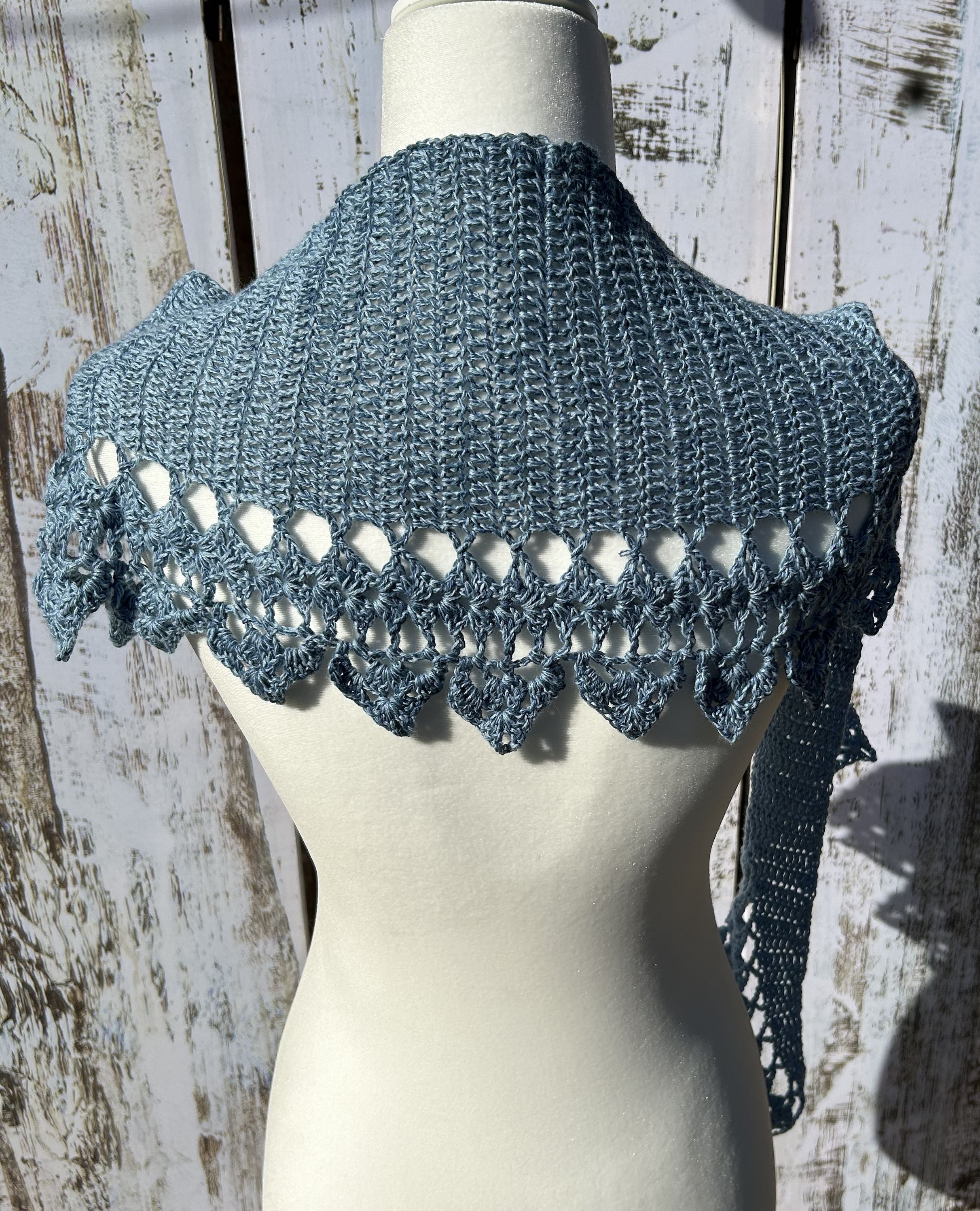 Not exactly a shawl since it's less than 10" wide at its widest point. More of a scarf or accent to wear around the neck.