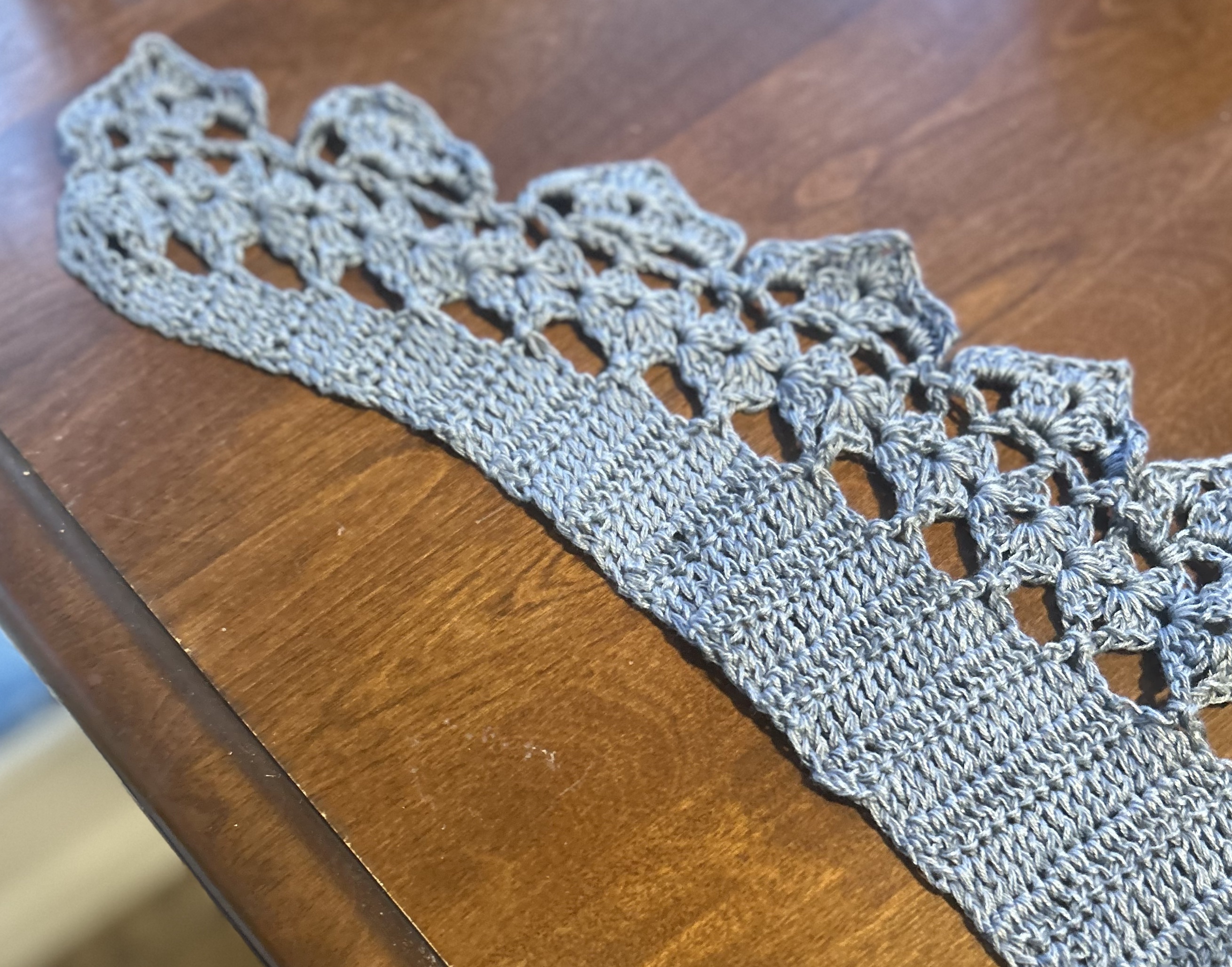 Long and slightly curved stole/scarf in a blue that grads between a darker and lighter blue, and then reverses. a wool/ acrylic blend yarn in "Crescent Motif Shawl" pattern by Lorene Eppolite.