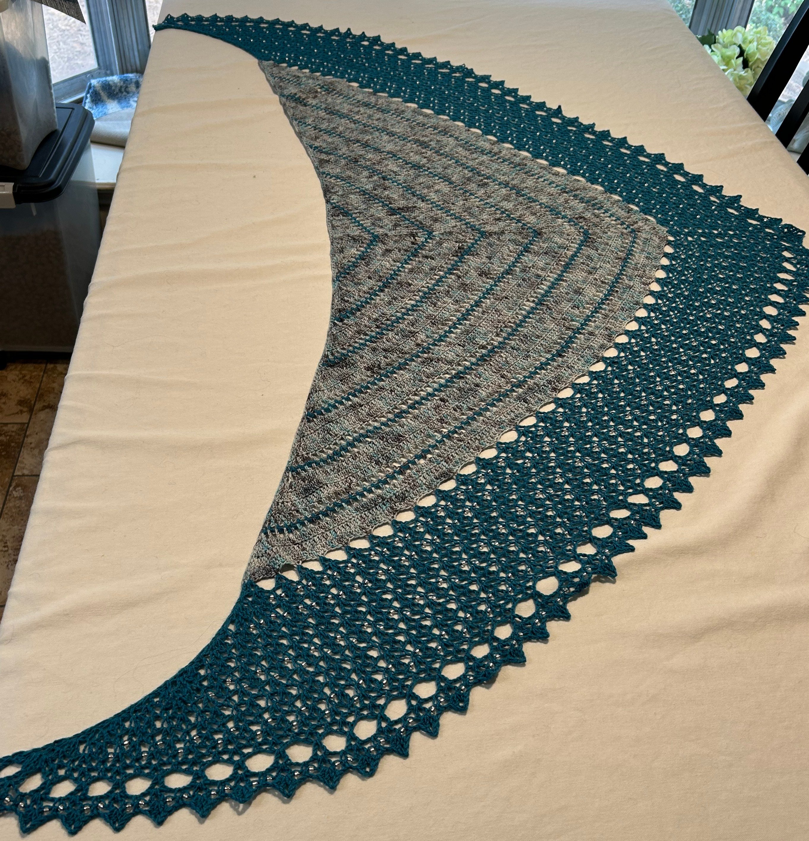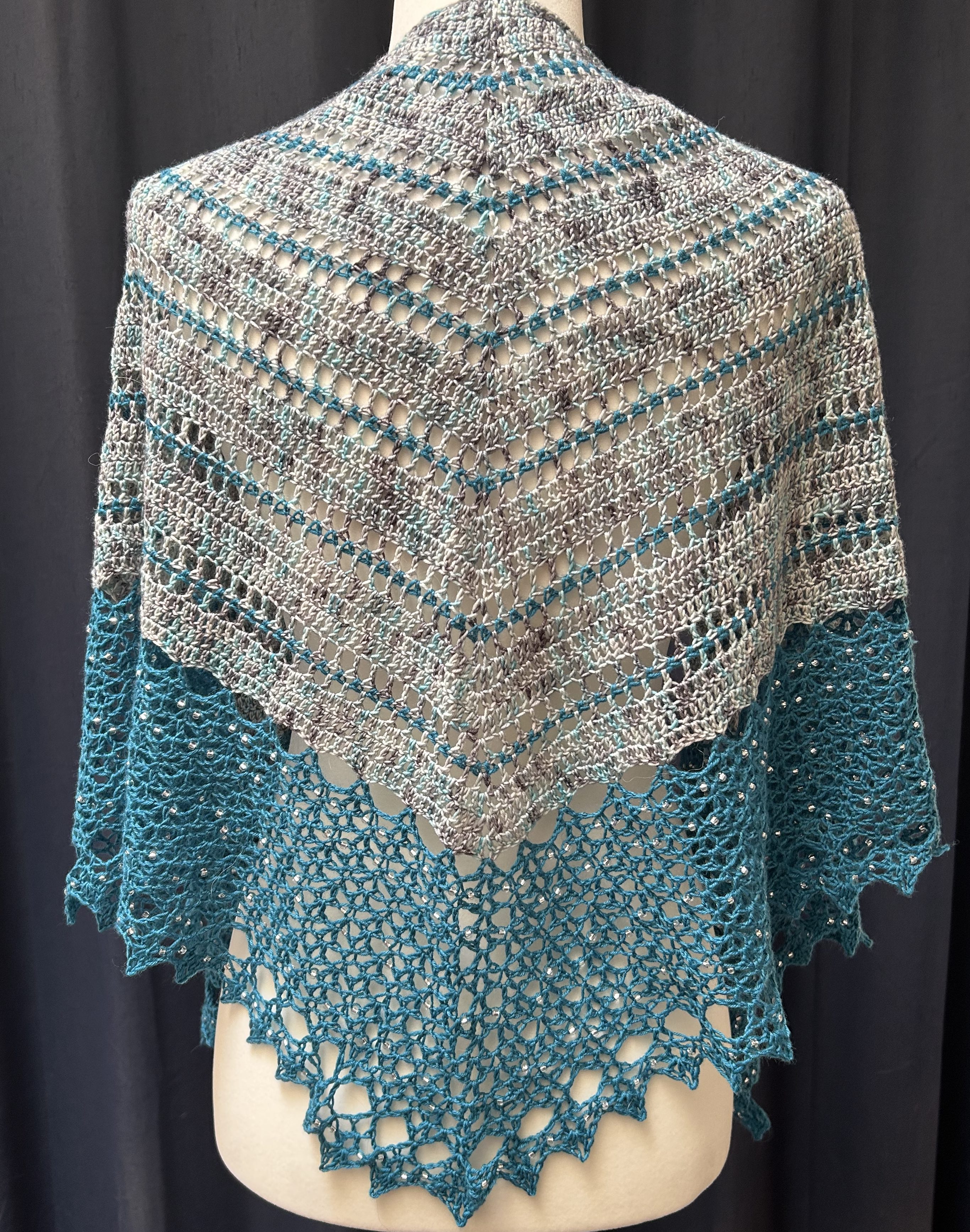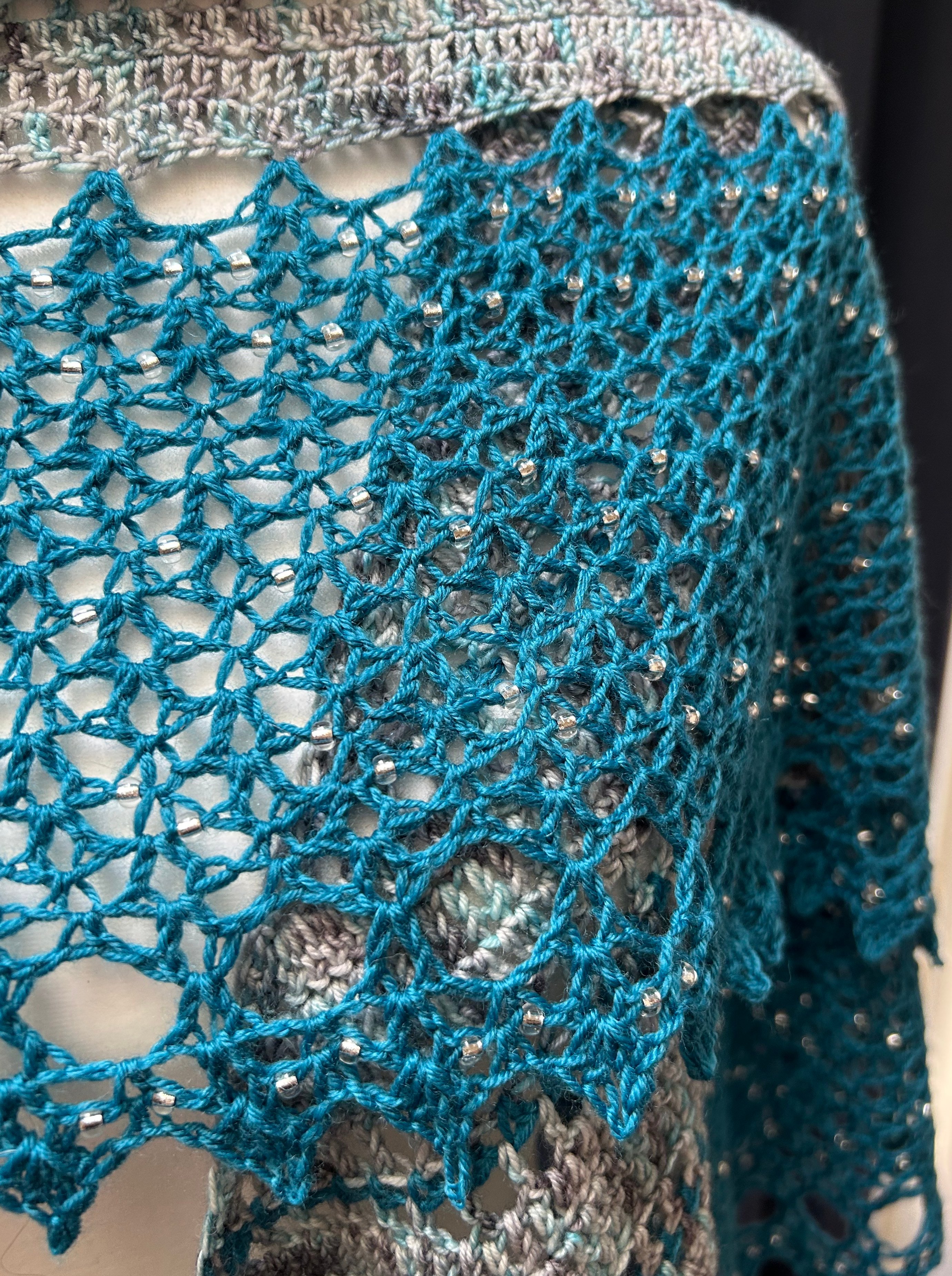 Heart shaped shawl with beading (Starlight Shawl pattern by Rachy Newin). Shawl in a hand-dyed multicolored turquoise and gray with edging in 'dark' teal. The edging has silver/crystal beading.