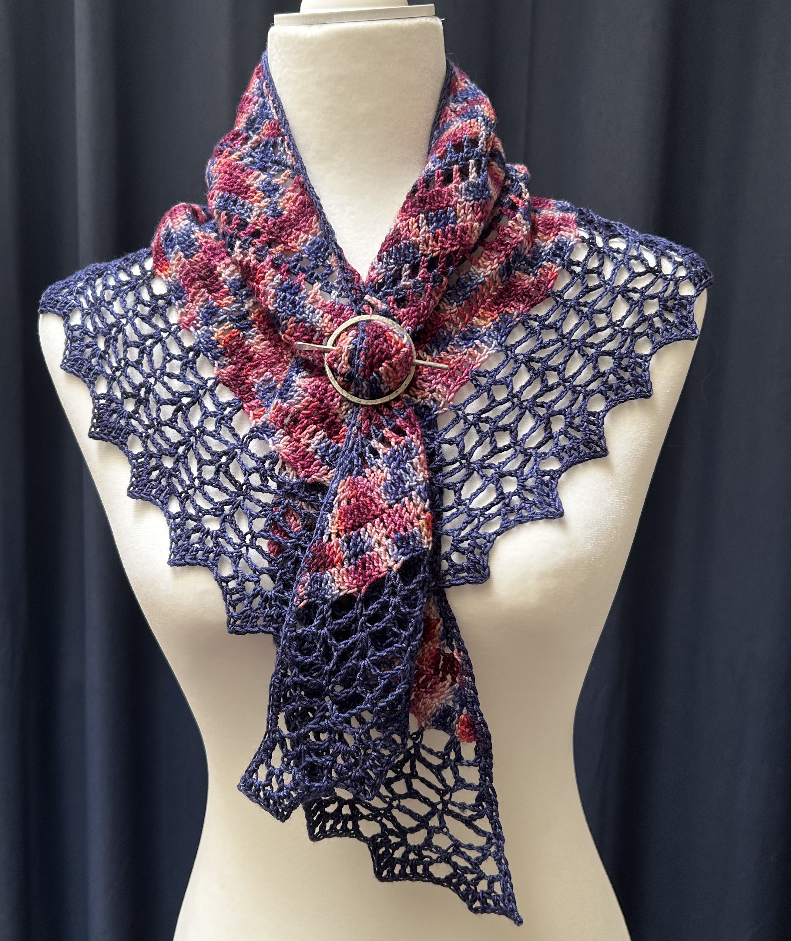 MINI Heart shaped shawl without beading (Starlight Shawl pattern by Rachy Newin). Shawl in a hand-dyed multicolored dark jewel tones with edging in a tonal navy. This is not a full sized shawl, more suited to add color around the neck. Shawl pin is not included.