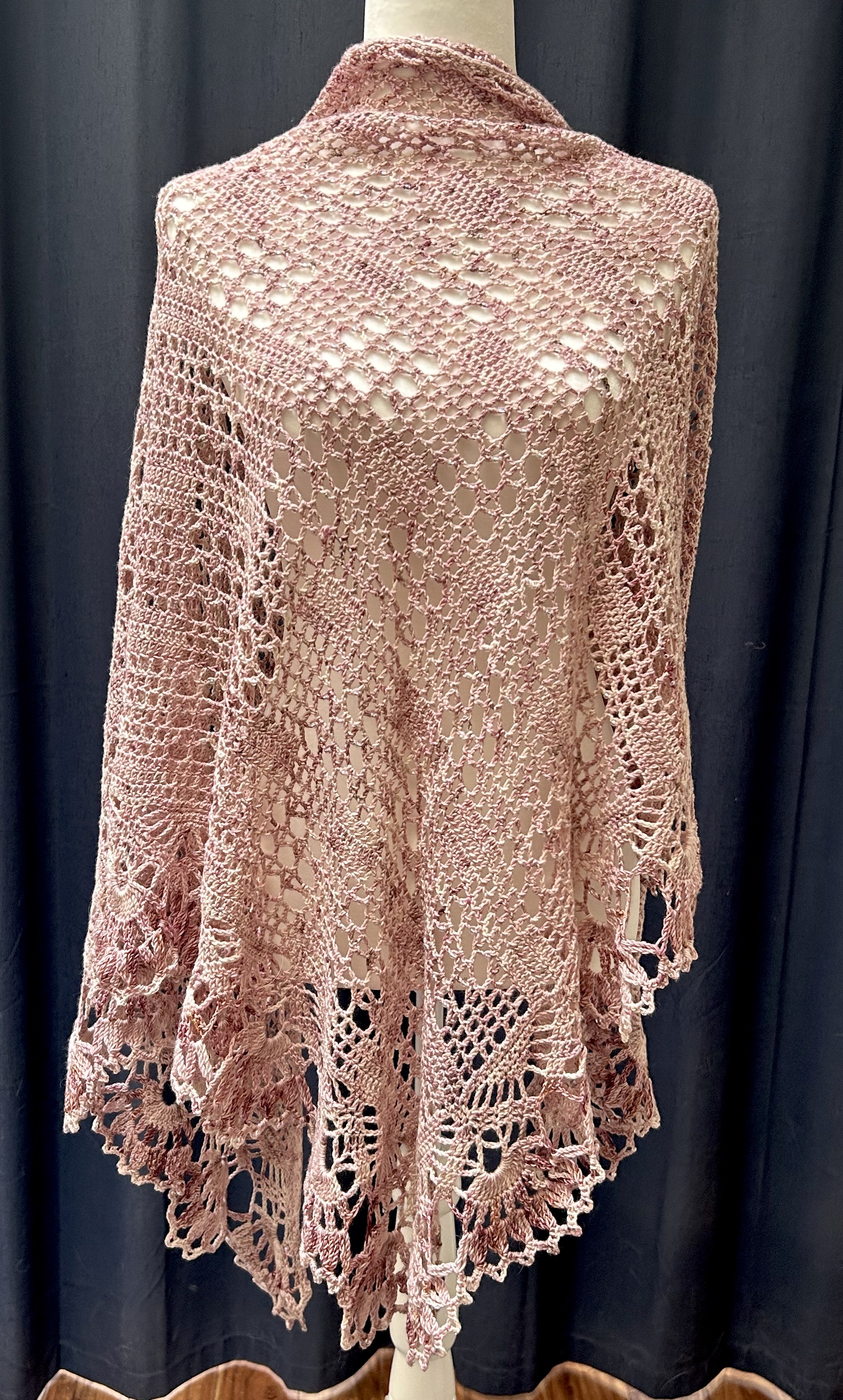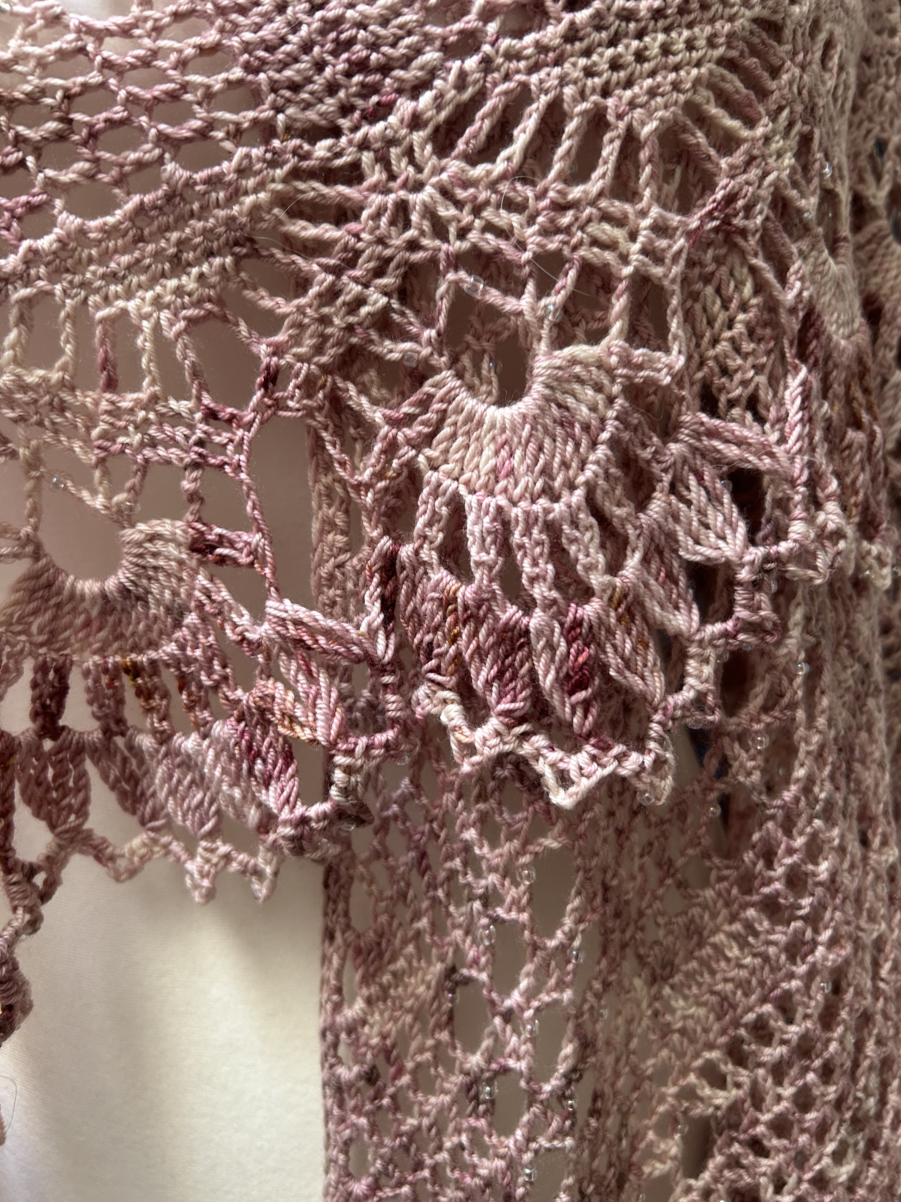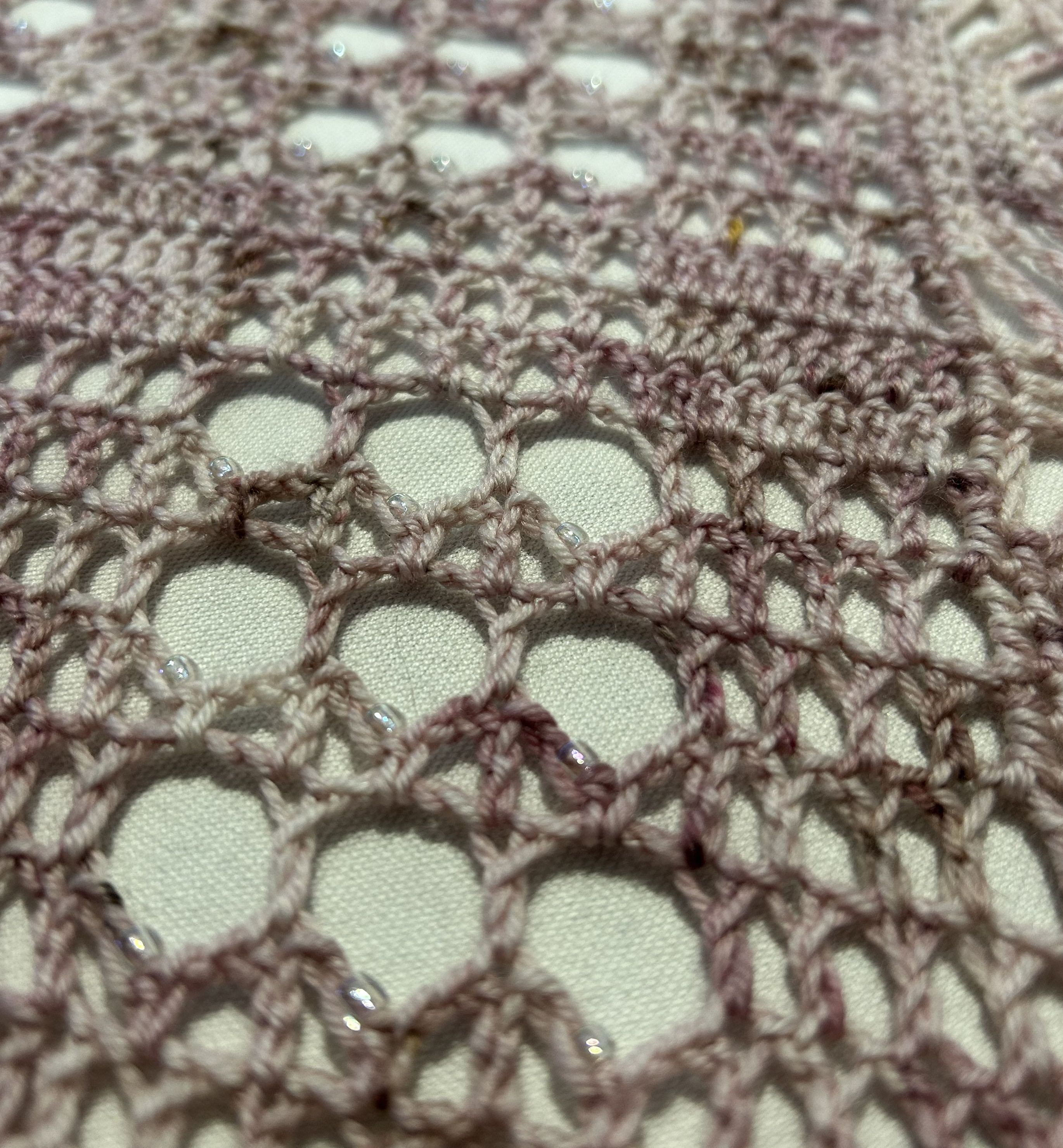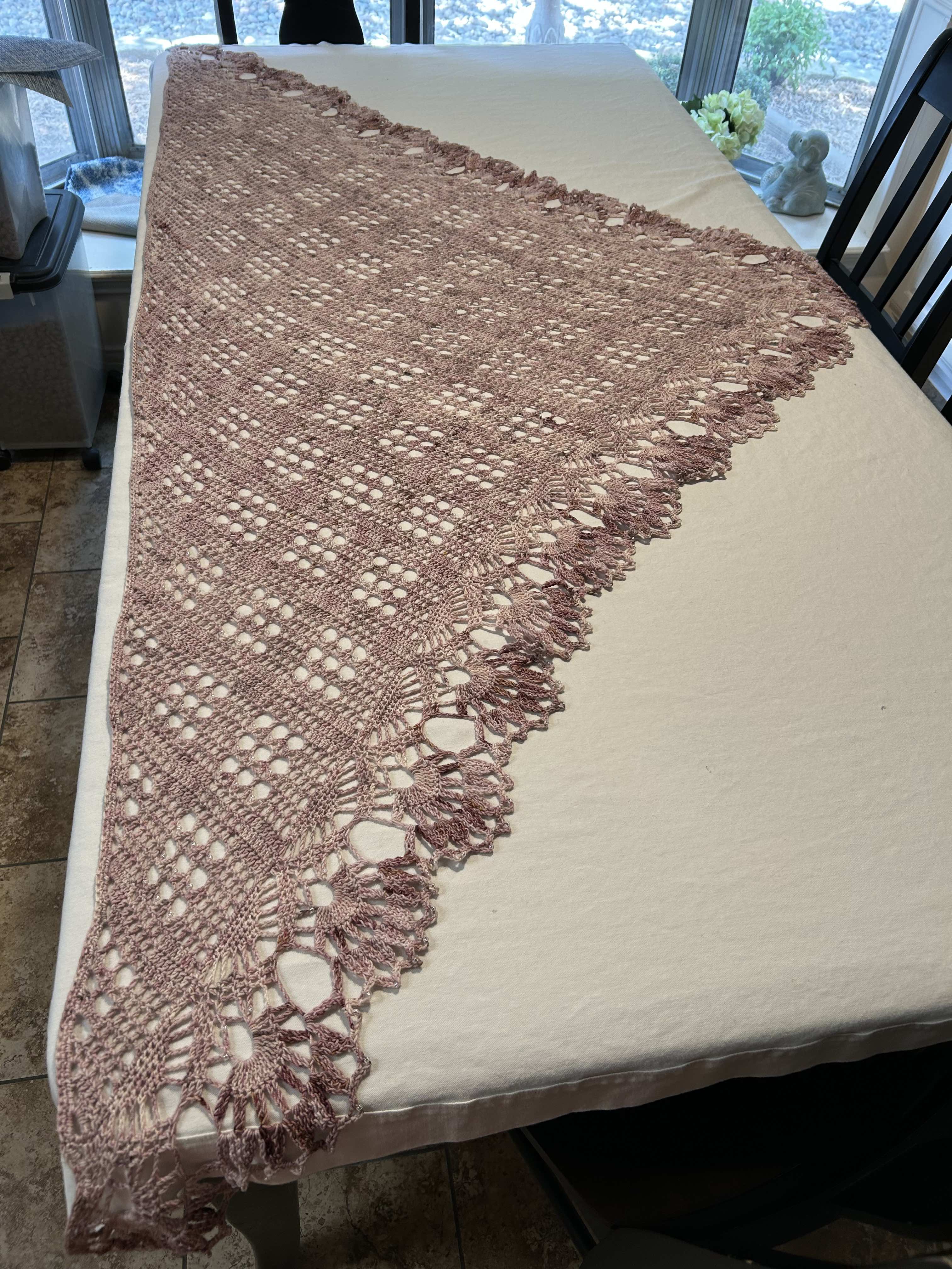 Triangular shawl with an ornate border ( Outlander Shawl pattern by Lily Go) Shawl in a mauve wool blend with hints of cream and brown, with extensive beading in 'crystal'. The body is made to mimic a plaid look. This is a large shawl, so please note the size and photos.