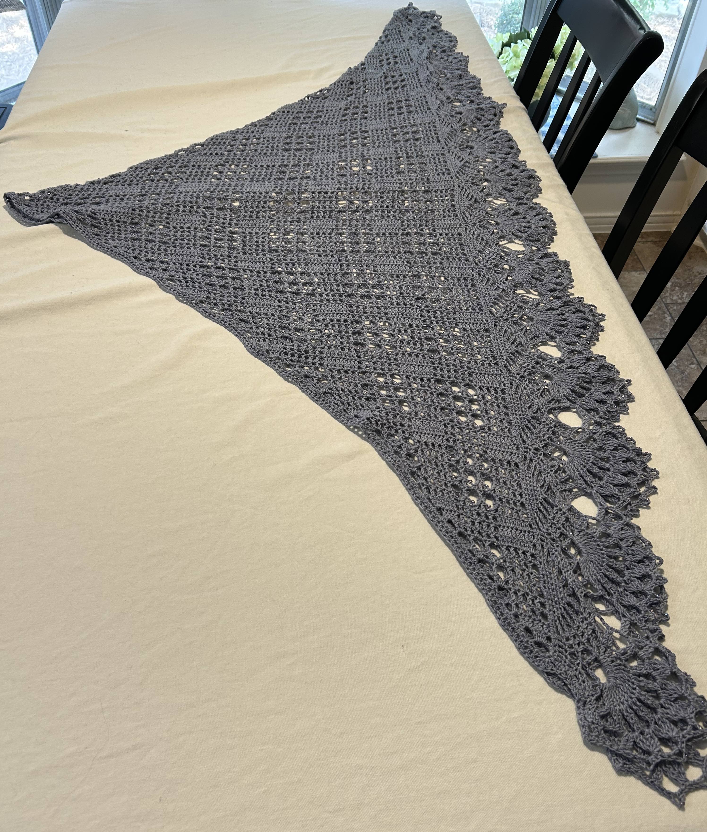 Triangular shawl with an ornate border ( Outlander Shawl pattern by Lily Go) Shawl in periwinkle blue superwashed merino wool with extensive beading in 'sugarplum'. The body is made to mimic a plaid look. This is a large shawl, so please note the size and photos.