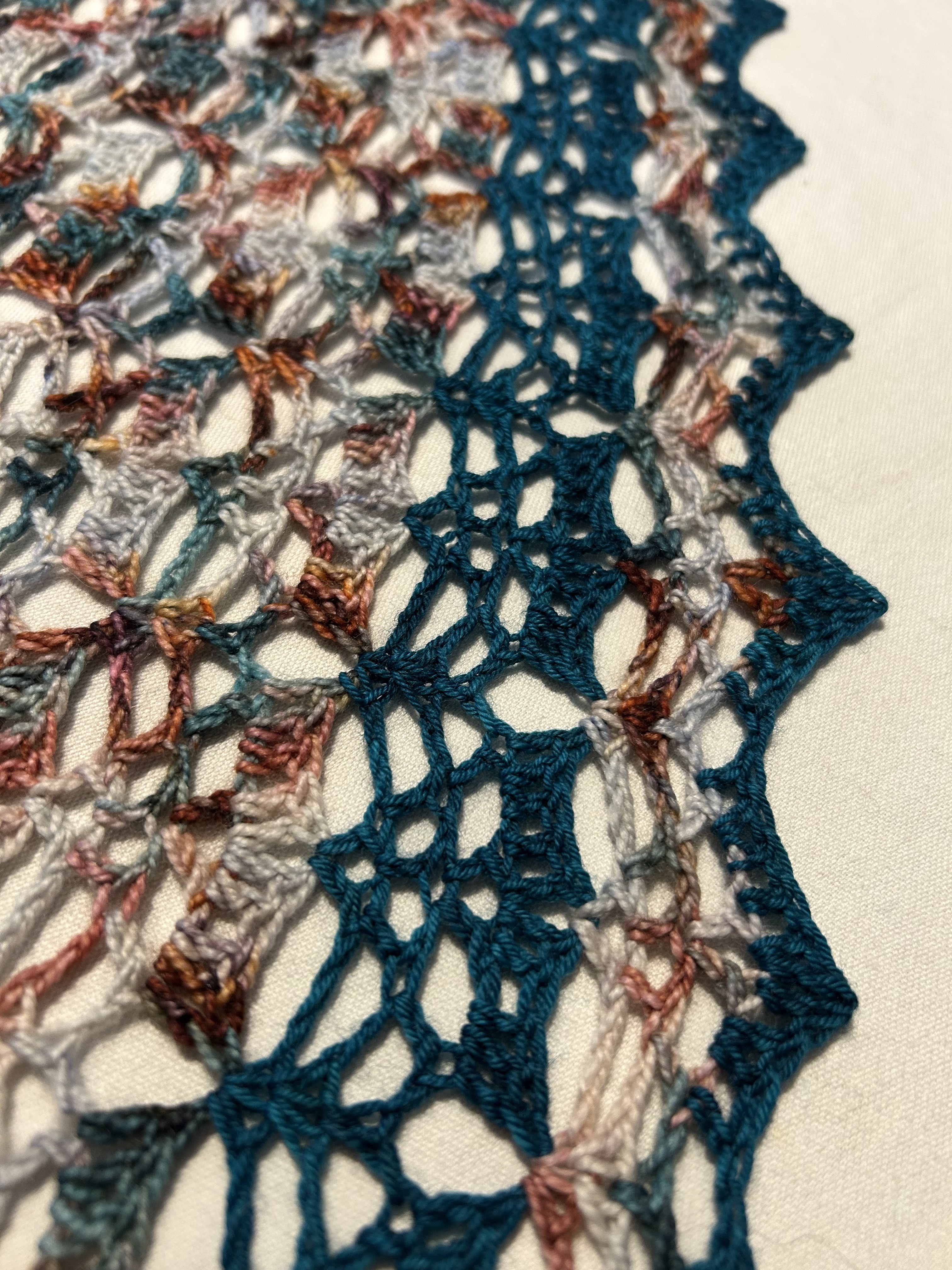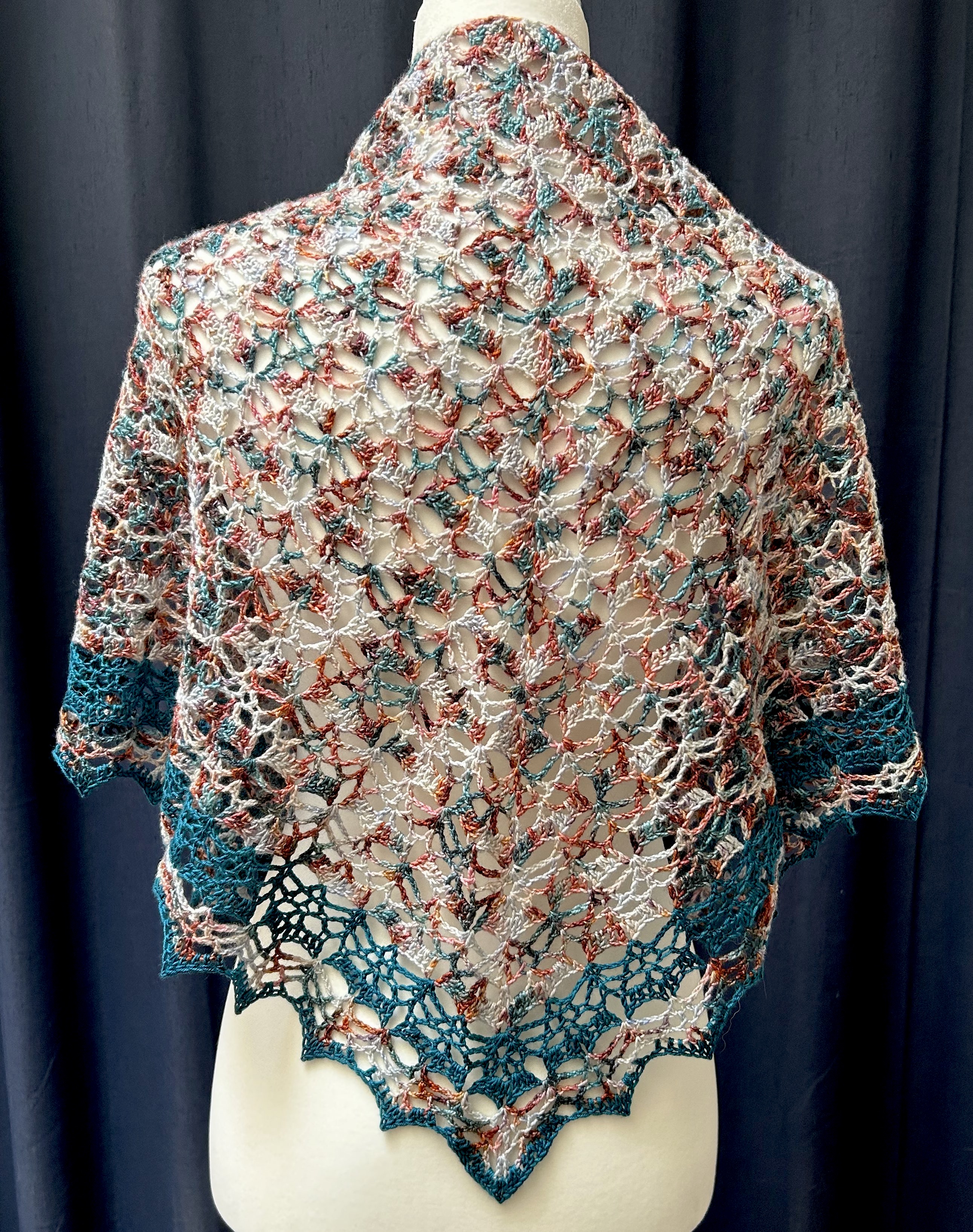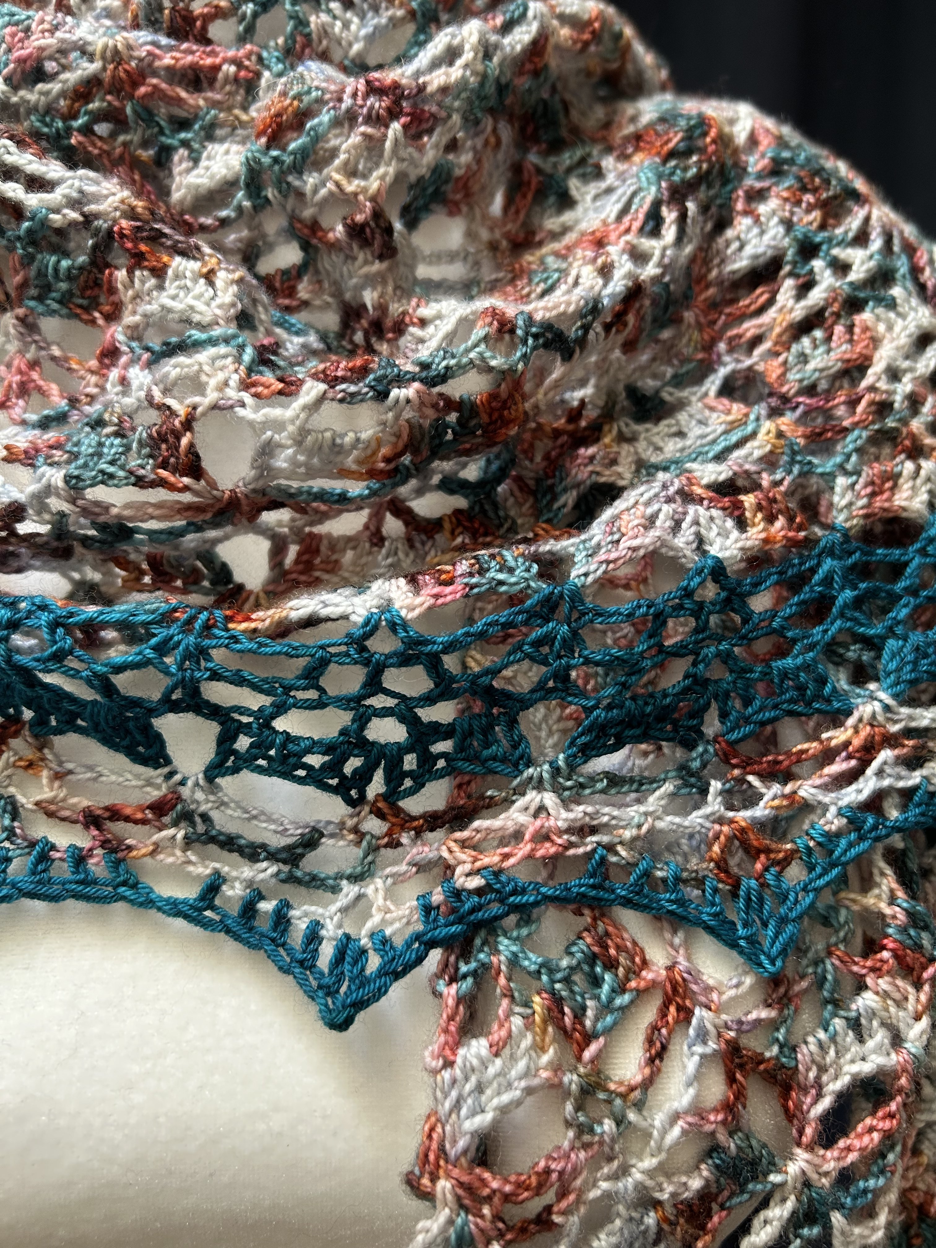 Triangular shawl with an ornate border ( From the Ashes Shawlpattern by Rachy Newin) Shawl in a variegated yarn in pumpkin to teal, along with teal edging. This is a smaller shawl, not full sized. Better to wrap around the neck for color.