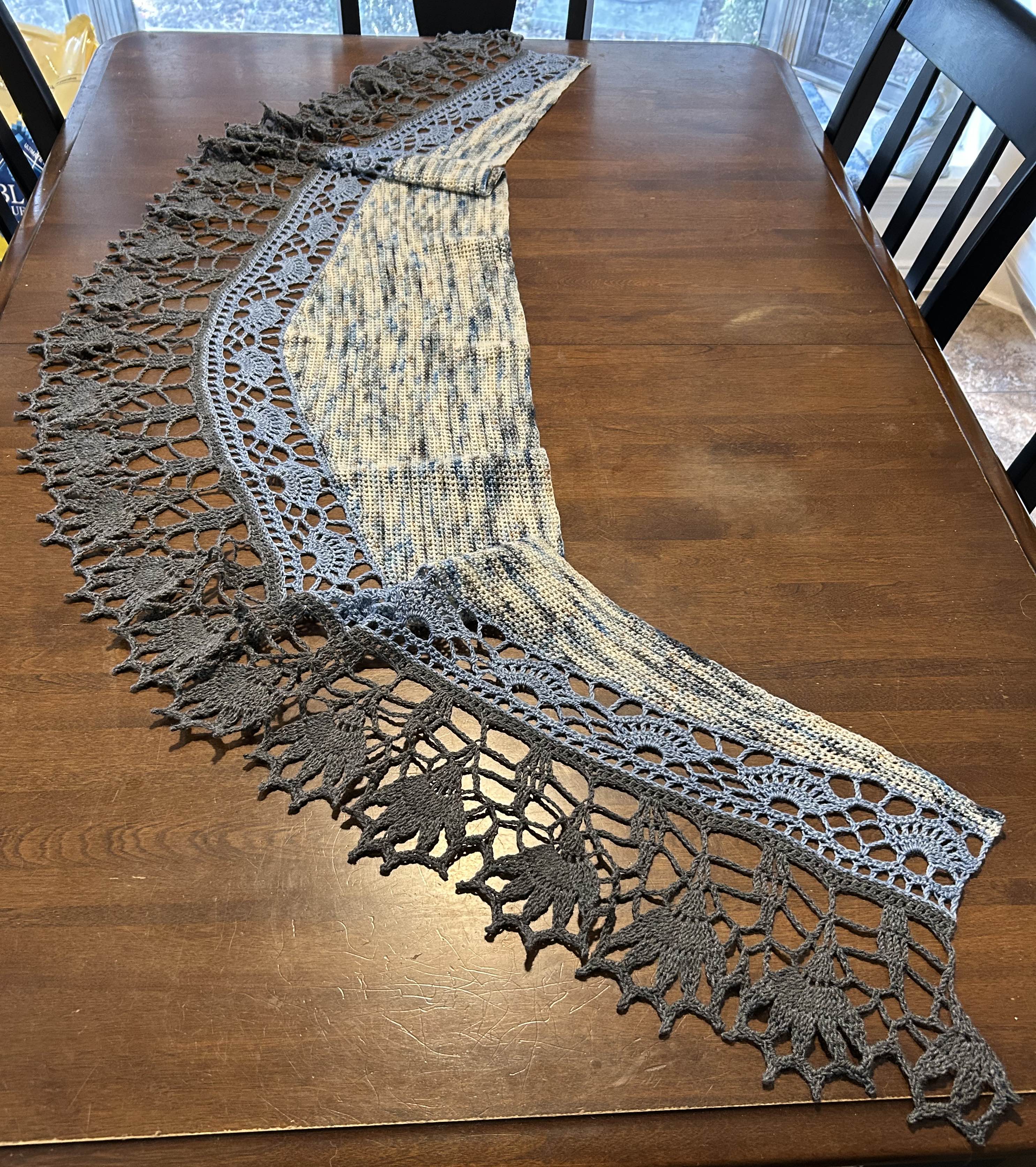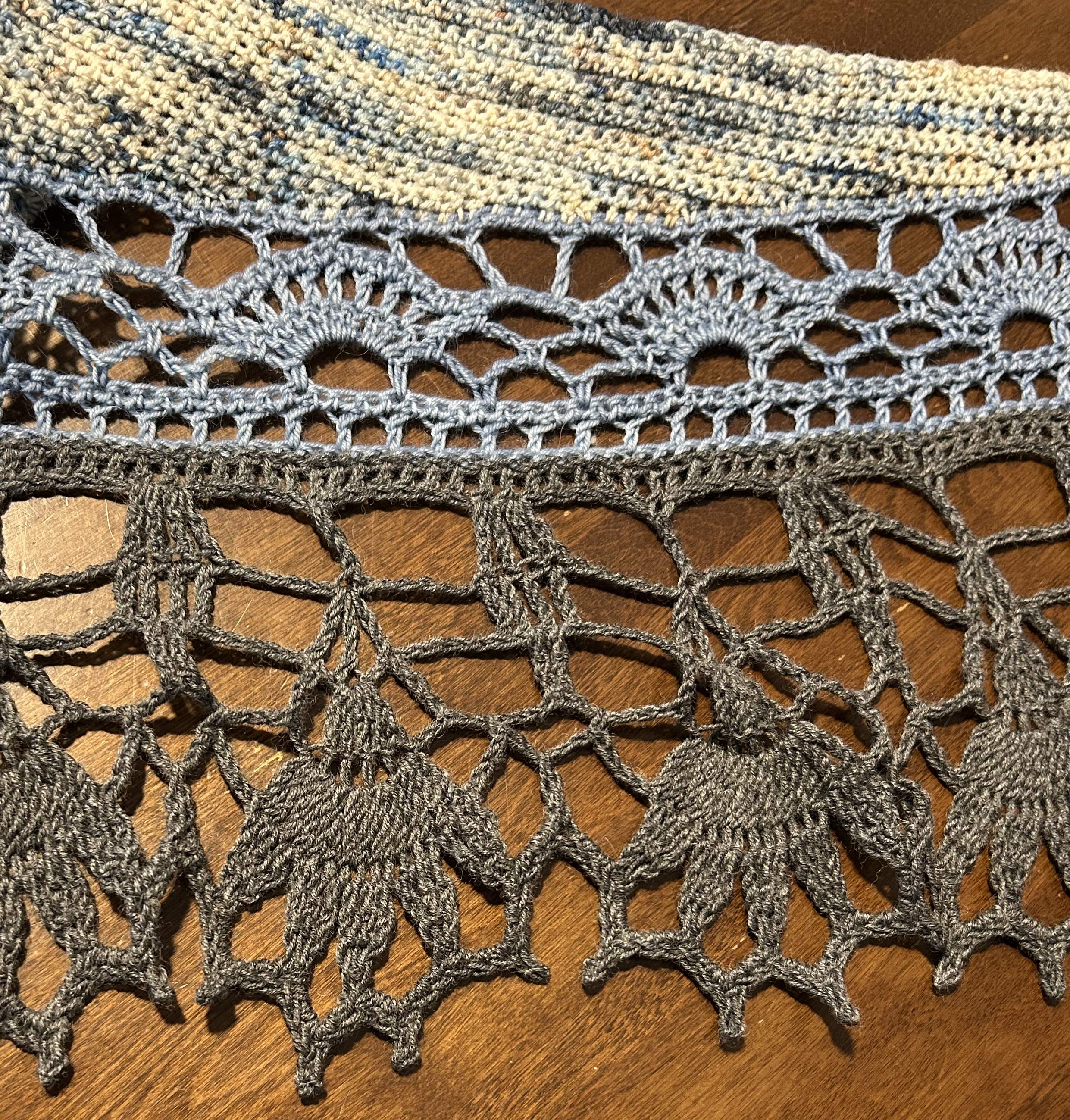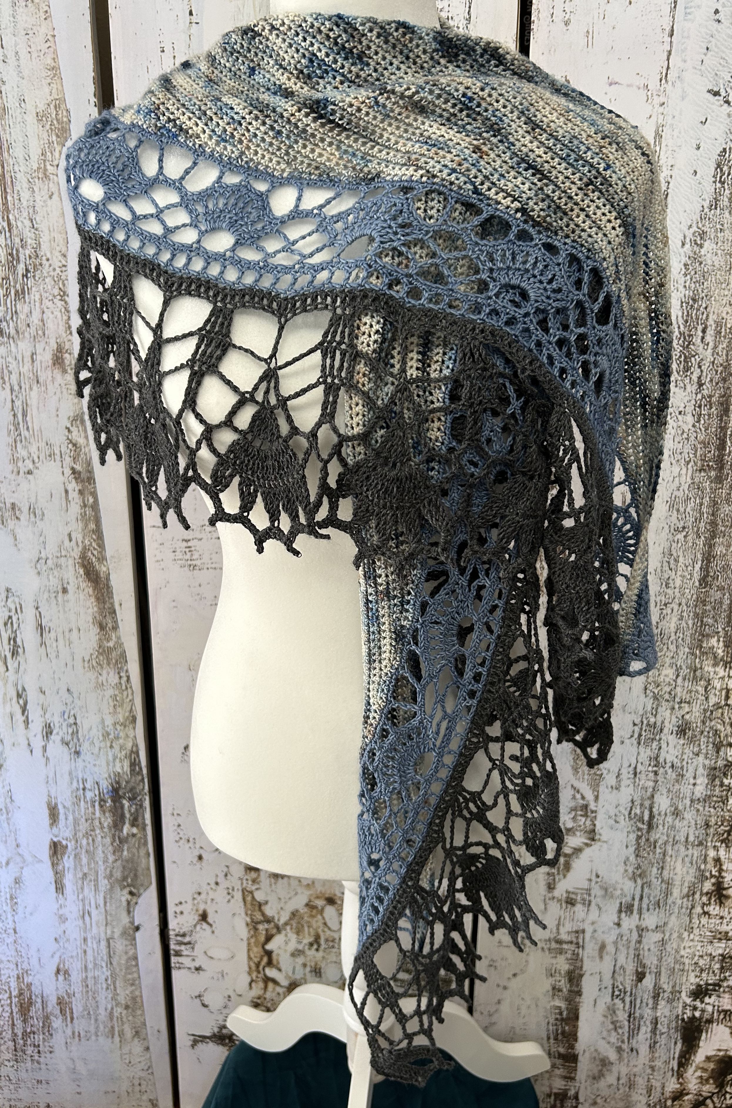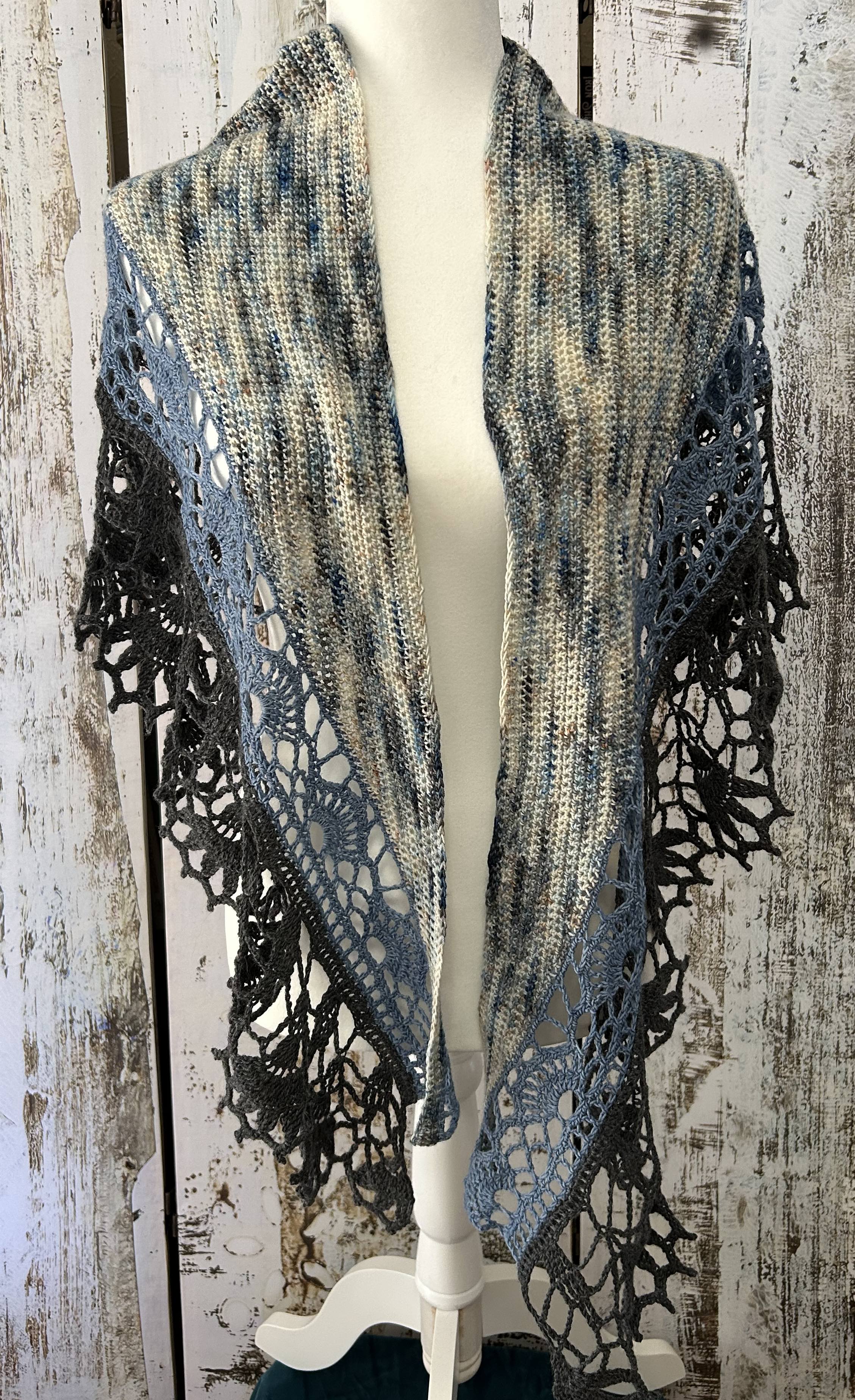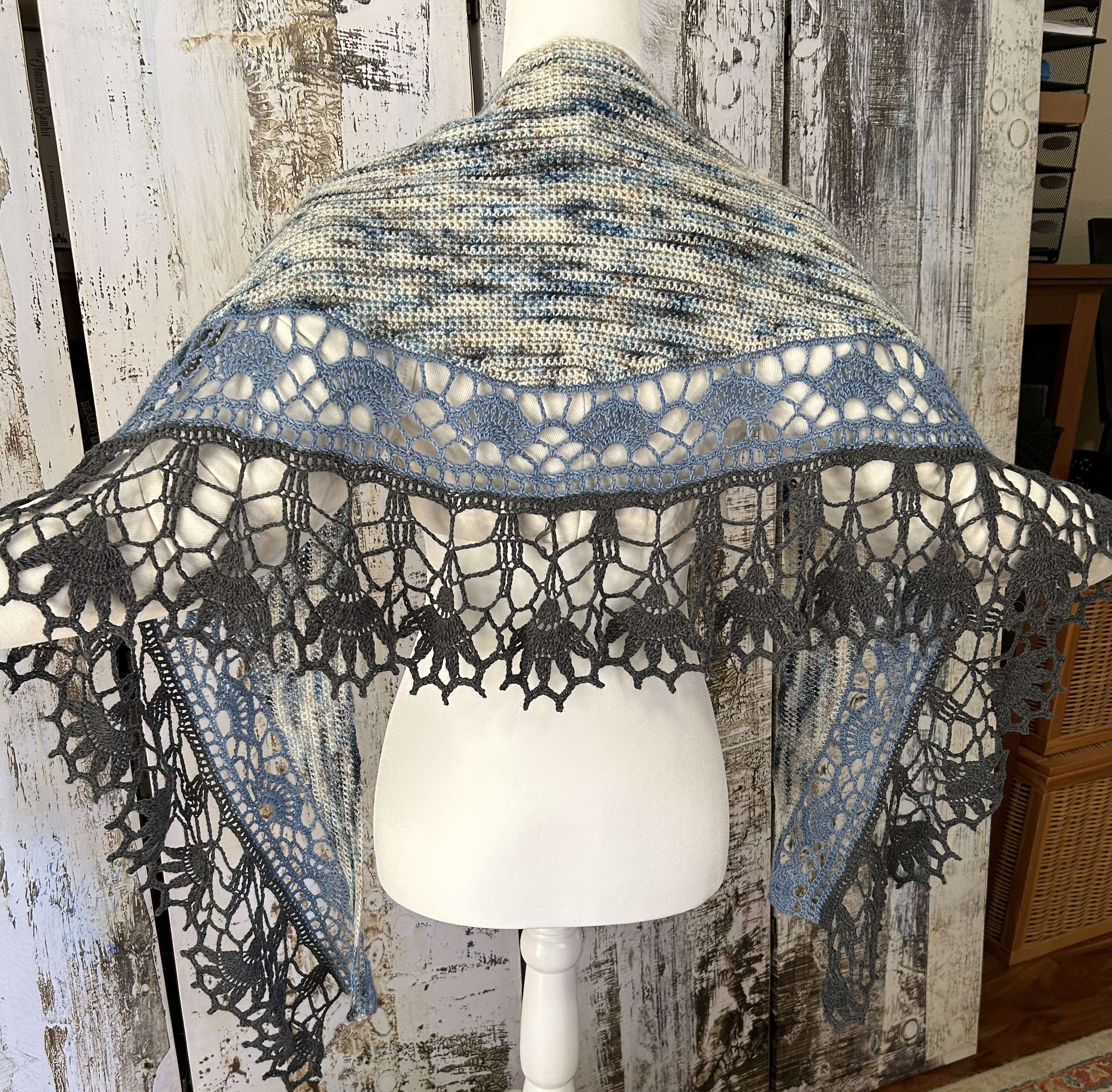 Wool Ilvy Shawl in "Rip Wheeler" yarn, with blue and charcoal gray trim